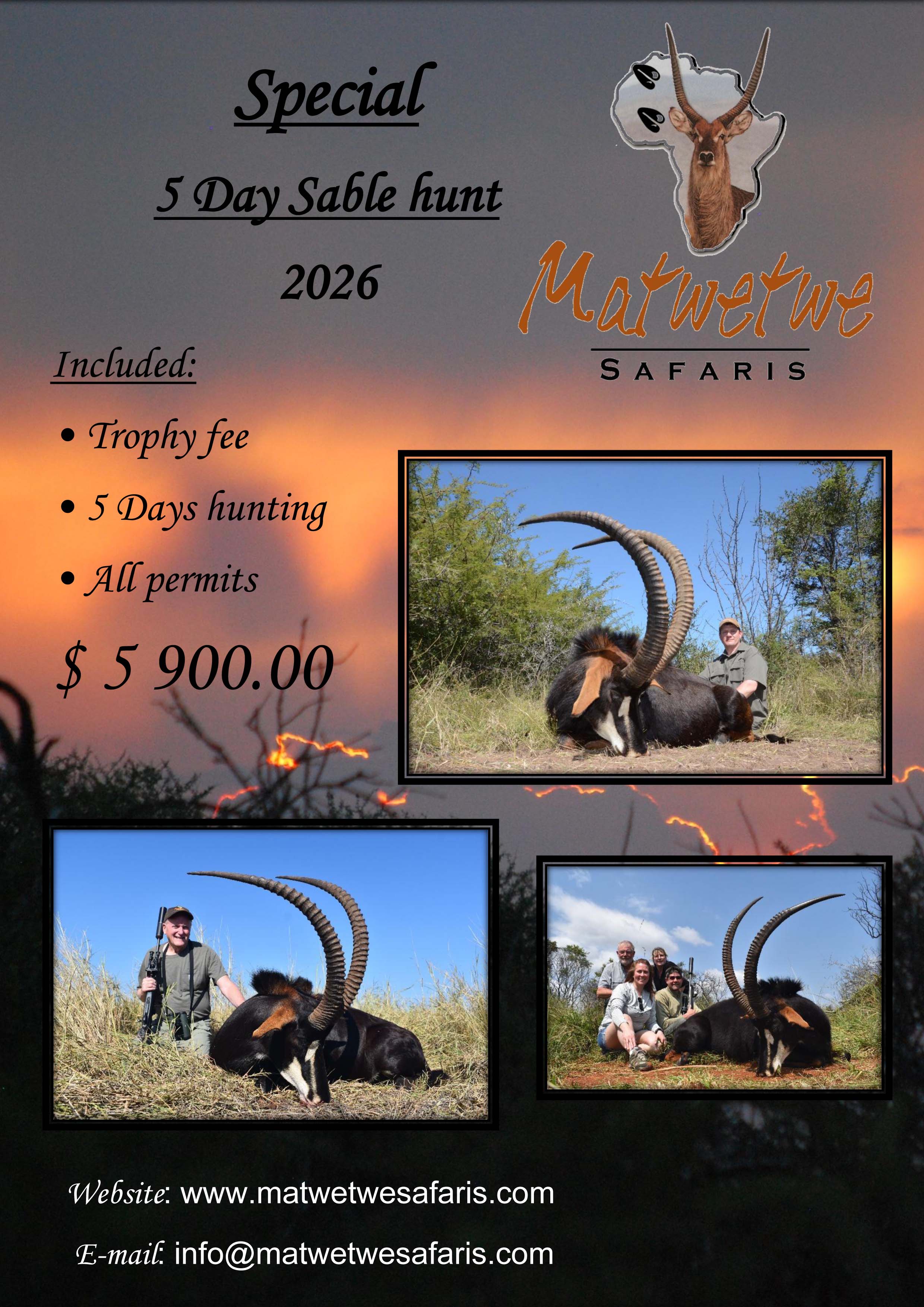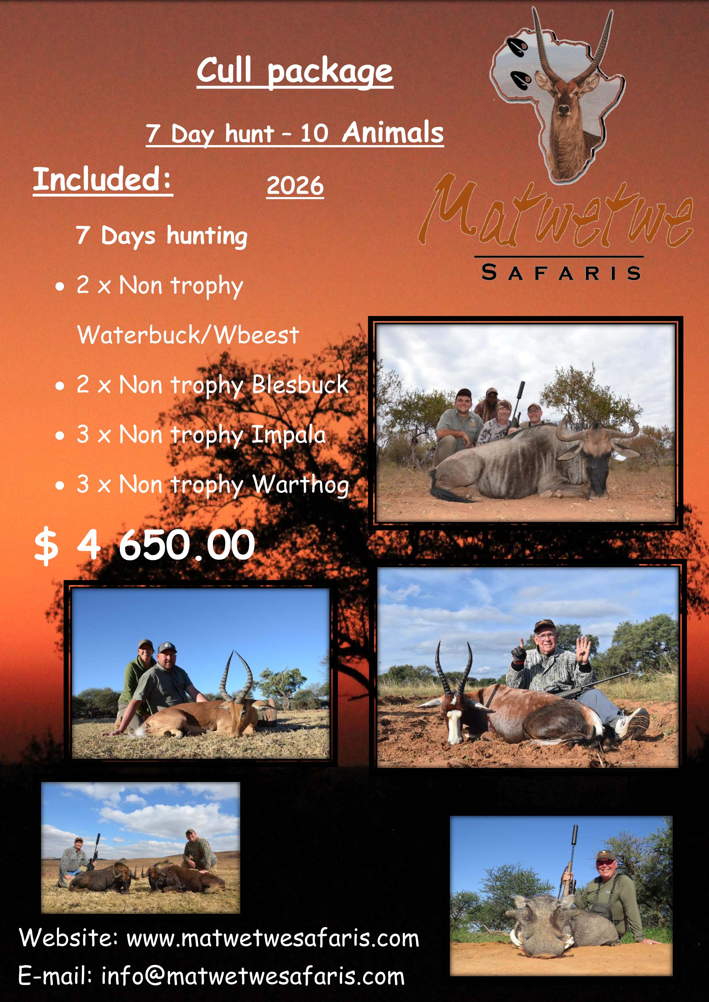 At Matwetwe Safaris you will be embraced by our hospitality, experience, great hunting areas, professional management, and finger-licking cuisine, making your dream a reality!