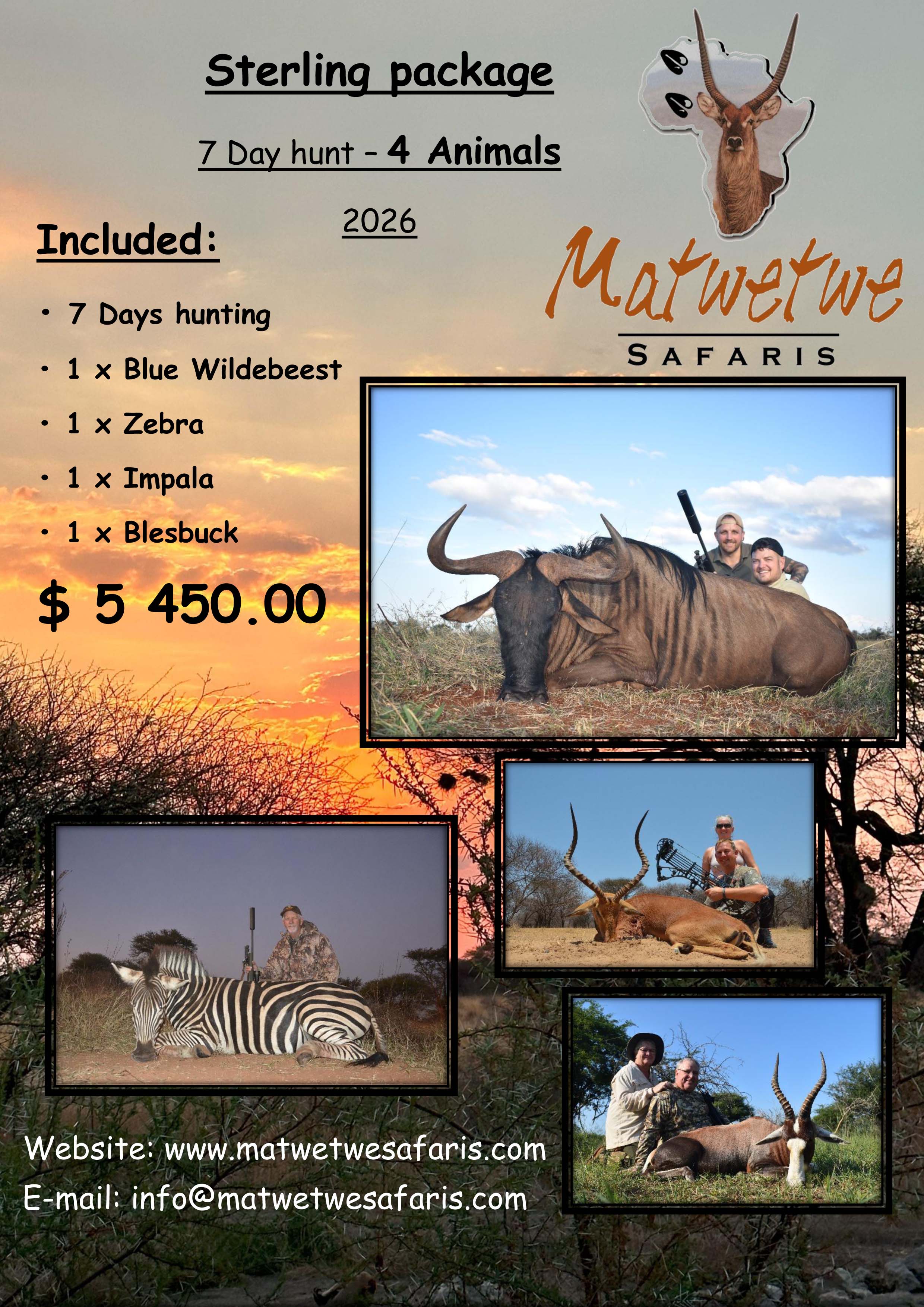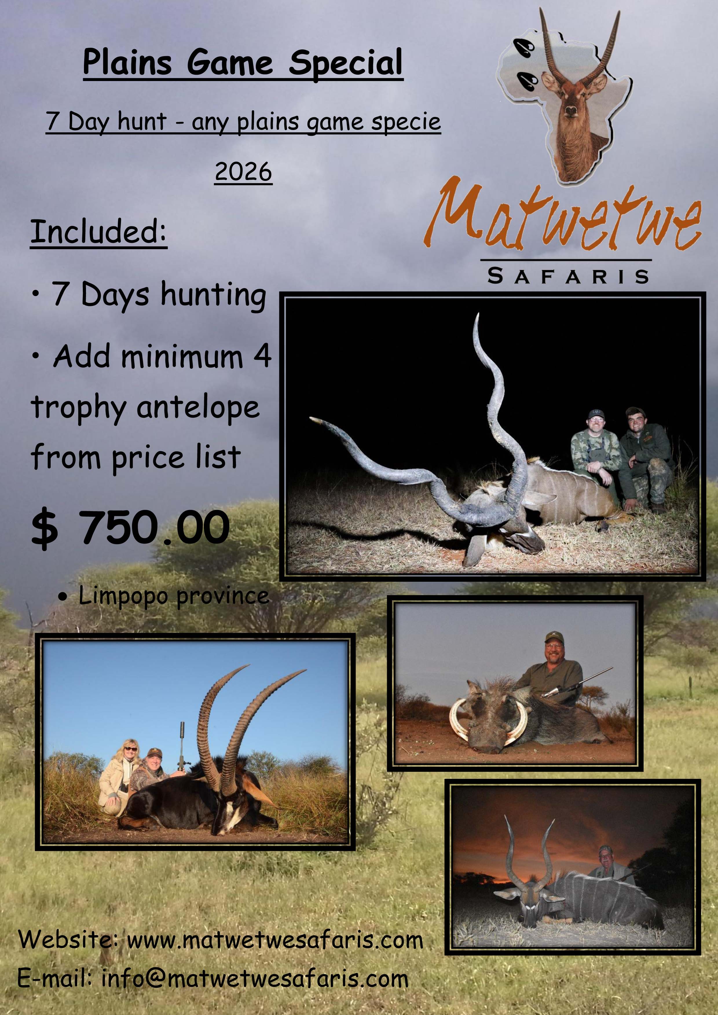 At Matwetwe Safaris you will be embraced by our hospitality, experience, great hunting areas, professional management, and finger-licking cuisine, making your dream a reality!